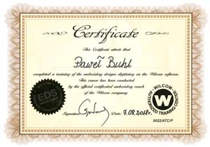Ciągle udoskonalamy swoje umiejętności, poniżej certyfikat odbytego szkolenia w zakresie tworzenia programów do hafciarek