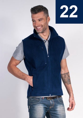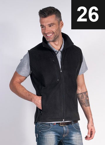 Opis: kamizelka polarowa; obustronne wykończenie antypillingowe zapobiegające mechaceniu się; kieszeń na piersi i kieszenie boczne zapinane na zamek; ozdobne szwy; wydłużony tył